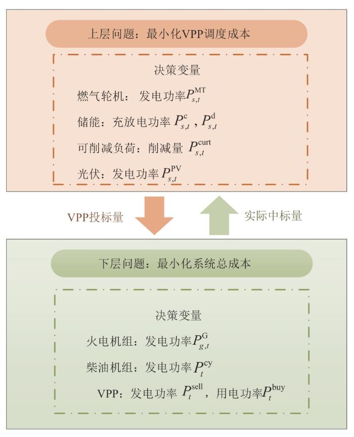 In order to achieve carbon peaking and carbon neutrality goals, the power system presents the trend of extensive access of multiple power sources. A multi-power coordination bi-level optimal operation model was proposed. In the upper level model, photovoltaic, gas turbine, energy storage and other power sources were aggregated into the virtual power plant, and the overall dispatching cost of virtual power plant was minimized through optimization. In addition, the conditional value at risk theory was adopted to measure the risks in view of the uncertainty of photovoltaic output. The lower level model was the system clearing model, which took the minimum total cost of the system as the optimization objective. It can consider the virtual power plant, thermal power units and diesel units to participate in the bidding, and output the actual bidding capacity of the virtual power plant back to the upper level, so that the virtual power plant can adjust the power output according to the actual bidding capacity. In order to solve the constructed model, Karush-Kuhn-Tucker (KKT) condition and strong duality theory were used to transform the bi-level model into a single-level model. Finally, an example was given to verify the validity of the model, the results show that the coordinated operation of multiple power sources can effectively reduce the operating cost of the system and improve the consumption rate of renewable energy.