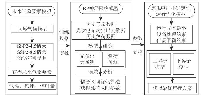 In order to effectively cope with climate change and promote the healthy development of virtual power plant, an uncertainty operation optimization model of virtual power plant (VPP) adapted to climate change was proposed based on the providing regional climate for impact studies (PRECIS), BP neural network prediction model and interval optimization algorithm. PRECIS was used to simulate the changes in meteorological factors such as temperature,wind speed and radiation under different carbon emission scenarios in 2025. The BP neural network model was used to predict the power generation of photovoltaic power plants based on the simulation results of PRICES. The interval optimization algorithm was coupled with the power generation prediction results to reduce the impact caused by the influence of photovoltaic power generation uncertainty on the simulation results of the optimization model. The results show that the model can not only generate the optimal operation strategy of VPP under climate change, but also reduce operating costs and improve economic benefits.