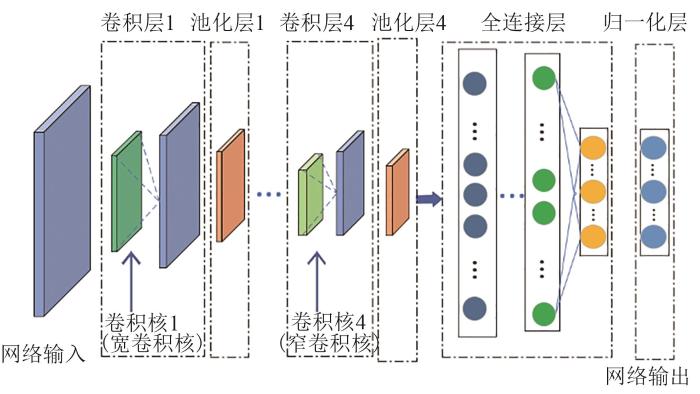 宽卷积深度神经网络 是卷积神经网络(convolutional neural network,CNN)的一种[19],其最显著的特点在于首层卷积层所使用的卷积核为宽卷积核。卷积神经网络中卷积核的大小决定了感受野的大小,即所提取信息的全局性。宽卷积深度神经网络所使用的宽卷积核在基于时域分析的故障诊断问题中可有效捕获周期性或波动性故障信号,避免了普通的卷积神经网络所使用的窄卷积核容易出现的无法将此类故障信号完全纳入感受野的问题。在使用宽卷积的首层卷积层将故障信息完全截取之后,再经过多层使用窄卷积核的卷积层对信息进行深层语义剖析,进一步提取其特征。