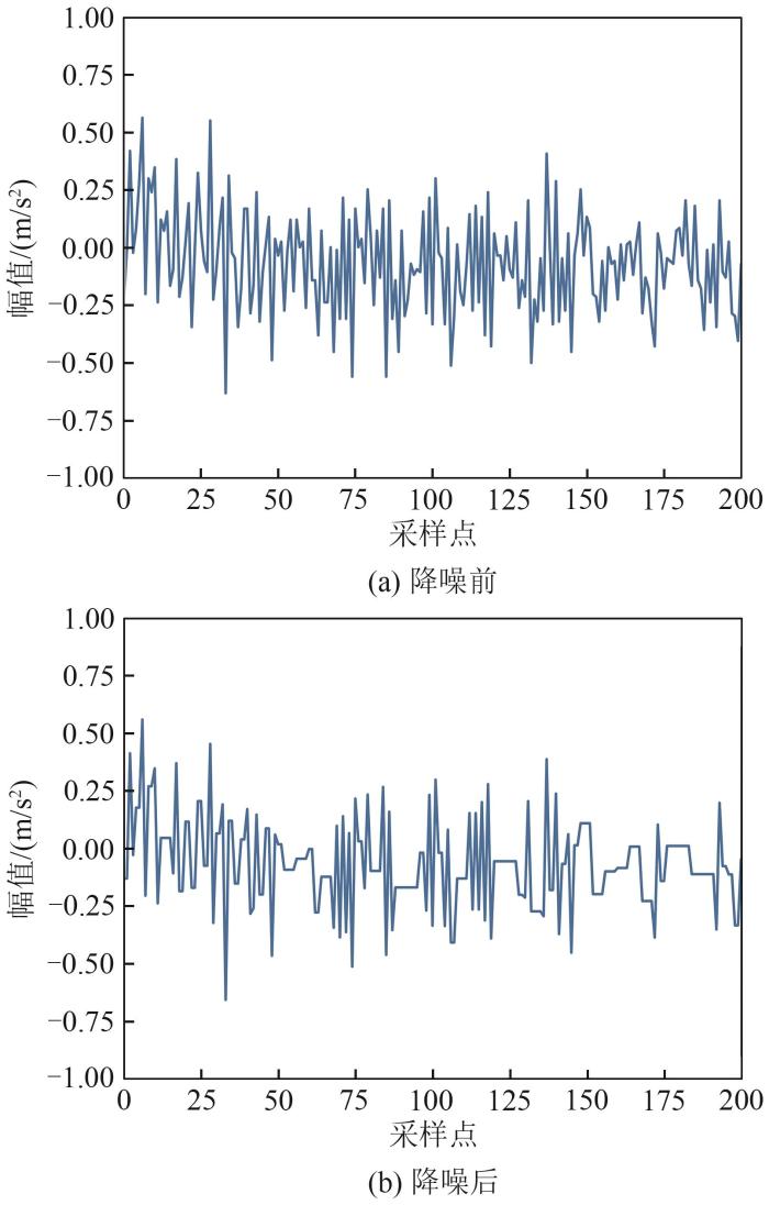 保留在大尺度(低分辨率)下的所有分解值,即保留信号主体的时频域特征;对小尺度(高分辨率)下的分解值设定一个阈值,保留小波系数高于该阈值的分解值,舍弃小波系数低于该阈值的分解值,即去除幅值相较于原始信号较小的突变噪声信号。最后对处理过后的信号进行逆小波变换,重构出去除噪声后的振动信号数据。