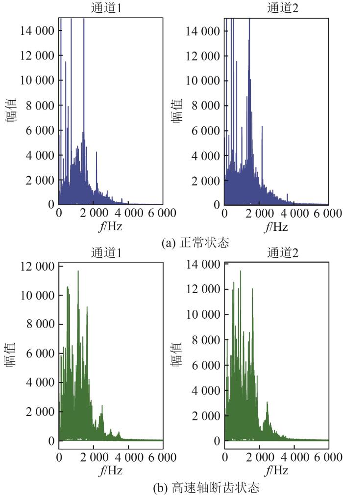 风机机组的振动信号数据不仅具有鲜明的时域特征,而且在频域上故障信号与正常信号也会有所区别。图5为某风电机组高速轴在正常与故障时的振动信号数据在频域上的对比。