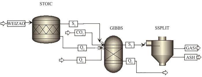 WEIZAO—杜氏盐藻;STOIC—化学计量反应器;Q1—输入热量;Q2—热解释放热量;S1—热解产物;GIBBS—吉布斯反应器;S2—燃烧还原产物;Q3—损失热量;GAS—气体产物;SSPLIT—气固分离模块;ASH—灰分。