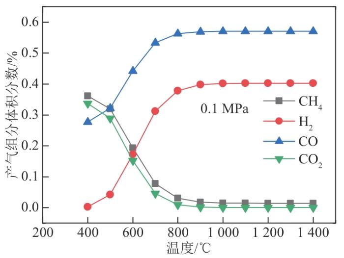 气化温度在900 ℃之后,CH4、H2、CO、CO2的体积分数随温度变化很小,这是因为反应(2)、(3)、(4)都为吸热反应,温度升高可促使正反应方向进行,使CO和H2生成量增多。而反应(6)、(7)为放热反应,当处于高温时,不利于反应(6)、(7)的正向进行,因此,随着温度的升高,使得CH4生成量不断地减少,会生成一部分H2;随着CO2的不断通入,反应(3)在高温下会生成大量的CO,CO和CO2的增加会使反应(4)、(5)往逆反应方向移动,仅会消耗一部分H2,此时生成H2的量和消耗H2的量会相互抵消,使得生成H2的量处于动态平衡中,所以H2的体积分数很稳定。