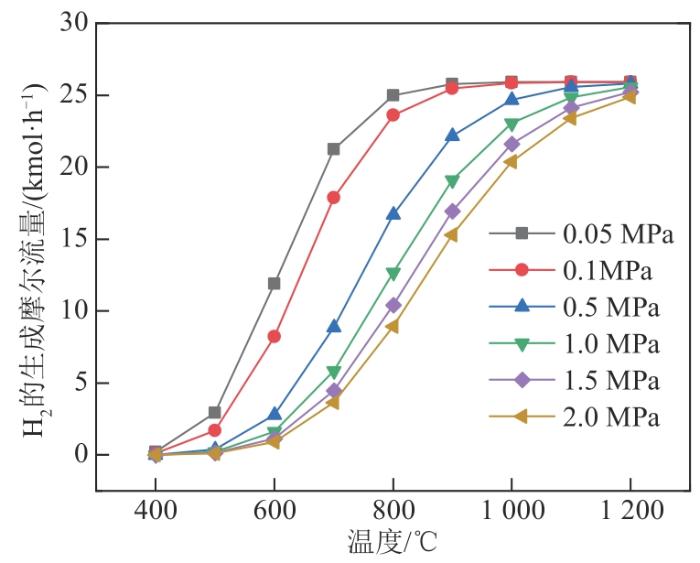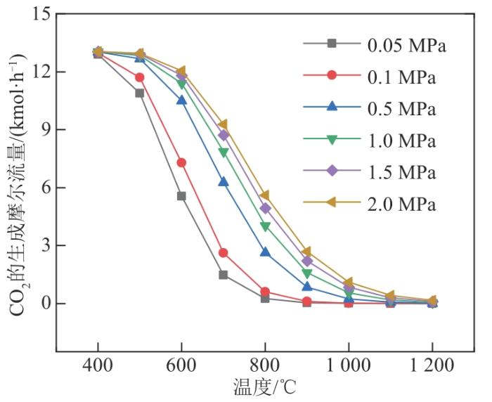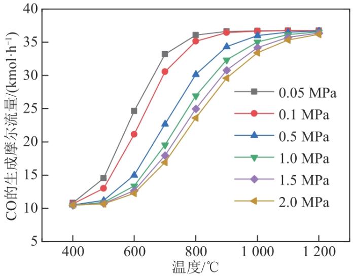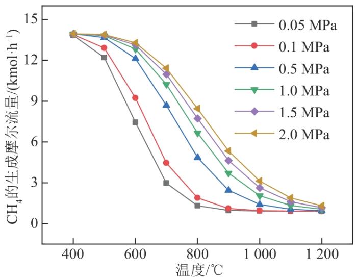 3)当气化温度在400~1 200 ℃,压强在0.05~2.0 MPa时,同一温度下,随着压强增大,CH4和CO2的生成摩尔流量会增加,而CO和H2的生成摩尔流量却减少;当温度为700 ℃时,压强对燃气的产量影响最为显著。