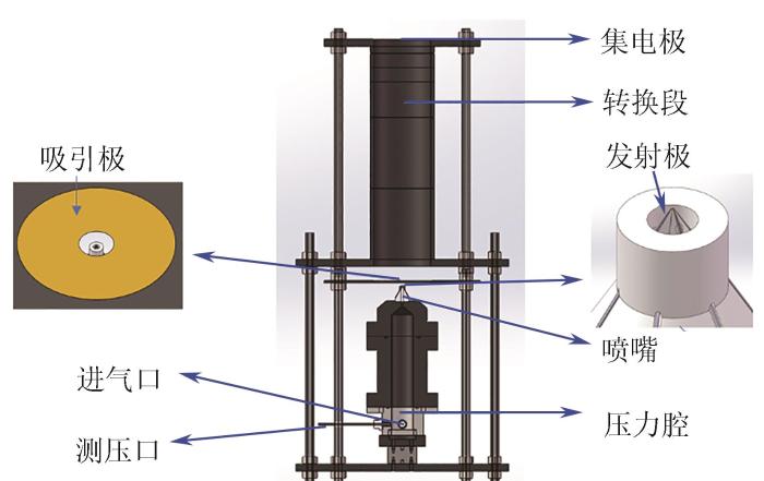本文的电气体发电实验系统由供气设备、测量设备、高压电源、自主设计的电气体高压发电装置等部分组成,如图1所示。其中供气设备为容量300 L、压力1.6 MPa的通用空气压缩机(型号为VF-1.05/16)。高压电源选用了上海晟皋电气科技的直流高压发生器(型号为ZJF-60 kV/5 mA),用以提供吸引极和发射极之间的电晕电压。