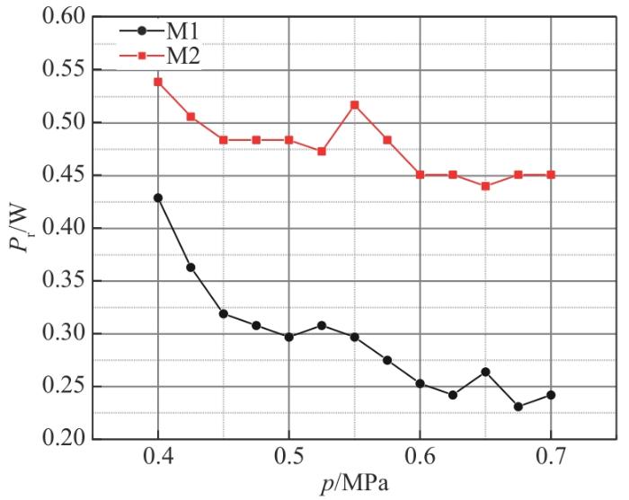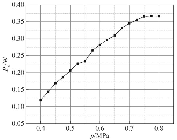 为了更直观说明该实验装置的性能,以p=0.6 MPa时的数据为例,按照理想气体等熵流简单估算喷嘴出口动能转化成电能的转换效率n。按照压力腔内气体总温为300 K,比热比为1.4,喷嘴流量系数为1进行估算,可得质量流量mg=12.7 g/s,喷嘴出口速度v=435 m/s,收集功率Ps=0.282 W。转换效率公式为