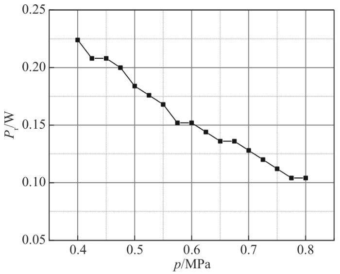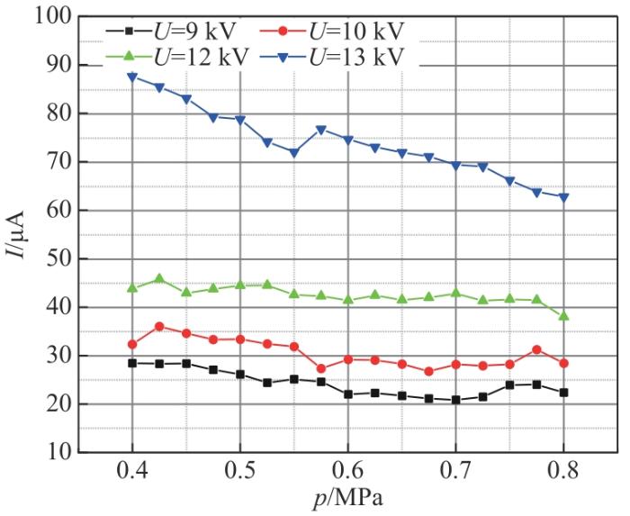 图6和图7显示,随着总压由0.4 MPa升到0.8 MPa,收集电压Us和收集功率Ps逐步增大,但增长速度逐步减慢,Us和Ps在相同负载电阻下的变化趋势相同。当总压从0.7 MPa升到0.8 MPa时,p-Us和p-Ps曲线逐渐趋于水平。电气体发电的能量转换是动能向电能的转换,气体总压的增大会加强从喷嘴喷出的气体动能,而更大的动能有利于产生更大的收集电压和功率。在电气体发电中,被输运的荷电粒子数越多,气流速度越快,发出的电能将越大。而Ps和Us增长速度减慢的原因主要有2方面:一是因为在总压增大的过程中,发射极处电离出去的荷电粒子变少了。图8为发射极电流I随着气体总压的增大而发生的变化,可以看到随着总压p的增大,电流I在持续减小;二是因为喷嘴的尺寸是固定的,出口气流的速度并不与总压成正比,总压越大,提升总压带来的气流速度提升将越小。