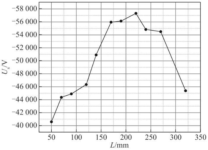 为了探究电气体高压发电装置的内部电势沿着转换段的变化过程,调整不同转换段长度进行试验。试验过程中,去掉负载,只使用高阻高压表进行电压的测量,以获取更接近于无测量状态下的电势值。以地势为零电势位,收集网处的电势与收集电压的值相同,所以后续仍针对收集电压进行分析。图11为在V=12 kV、d=15 mm、h=6 mm、p=0.8 MPa工况下,不同转换段长度电气体高压发电装置的收集电压变化曲线。可以看出,当转换段长度L从50 mm增加到220 mm时,收集电压随着转换段长度增加而增加;当转换段长度由220 mm增加到320 mm时,收集电压开始逐步下降。整体上收集电压随转换段长度的变化呈一条抛物线。
