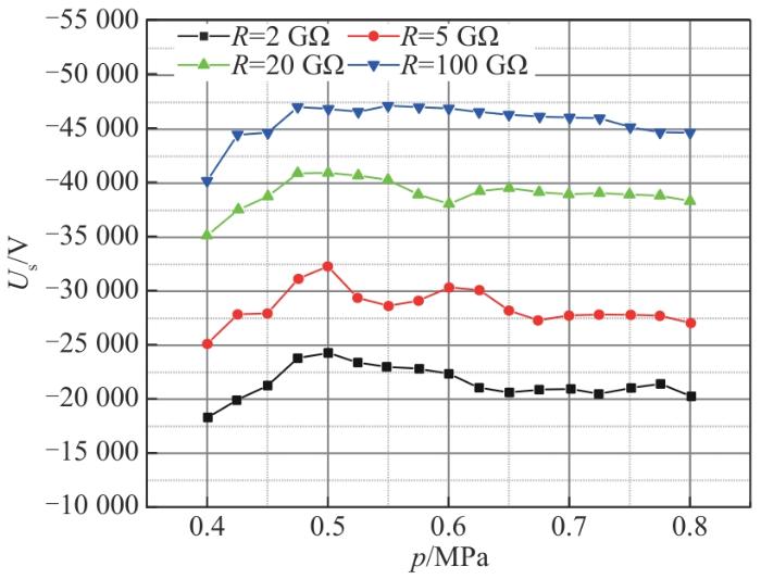 在本文试验中,是将集电极和地线之间的高电压直接作用于一固定电阻上来模拟实际用电器,并基于此测量收集到的功率。通过更换不同阻值的负载,得到不同负载阻值下电气体高压发电装置的电气特性。图 12为不同负载阻值下收集电压的变化,R=100 GΩ的曲线是去掉负载后单独使用高阻高压表测得的数据,可以看出,随着负载阻值增大,测得的收集电压Us也在不断增大,同时随着阻值增大,收集电压的增加速率在不断减缓。而随着负载的不断增大,收集电压将会趋近于一个最大值,而这个值为集电极不连接任何测量电路的情况下,集电极和地线之间的电势差。