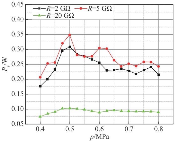图 13为不同负载阻值下的p-Ps曲线,可见,R=5 GΩ时收集功率最大,而R=20 GΩ时收集功率相较于R=2 GΩ和R=5 GΩ时有明显下降。由于整个装置的电流十分微弱,集电极附近的荷电粒子总数较少,当负载阻值较小时,可流经负载的电流受限,无法提高。当流经集电极的电流维持在固定值时,收集电压大小与阻值成正相关。而当阻值足够大时,到达集电极的电荷将不再充分吸收,电流不再受限,而随着阻值继续增大,收集电压增速渐趋缓慢。因此当R从2 GΩ增加到5 GΩ时,结合功率计算公式Ps=Us2/R,收集功率增加,而R从5 GΩ到20 GΩ时,收集功率减小。