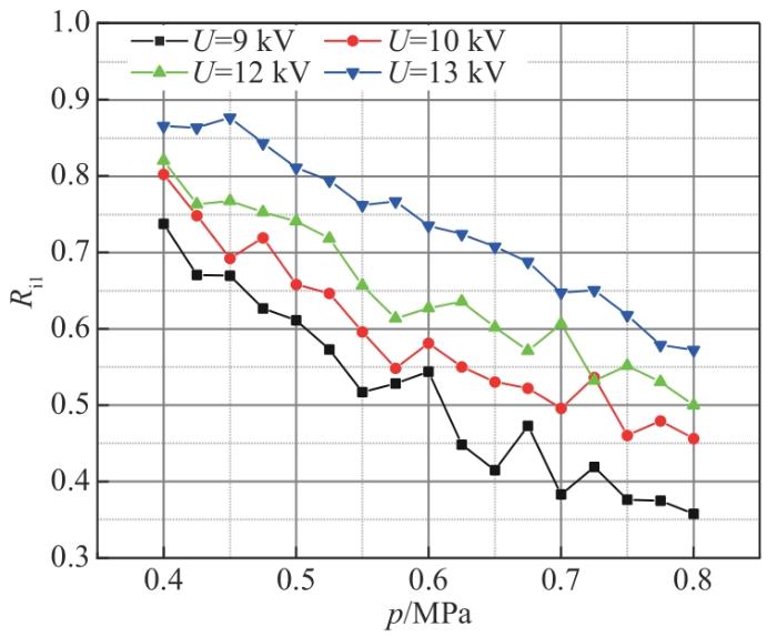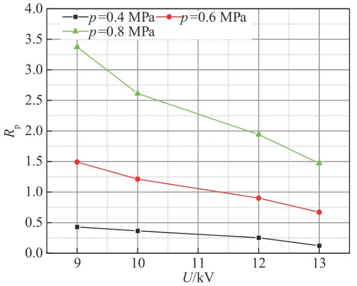 虽然电晕电压的提升会带来收集功率的提升,但同时也带来了电晕功率的提升。图18为不同总压下,收集功率和电晕功率之间的比值Rp随着电晕电压的变化,可以看出,随着电晕电压的增大,Rp在不断减小。这意味着在其余工况不变的情况下,电晕电压越高,电气体高压发电装置产生单位电能所需要的输入电能也越高;总压越高,出口动能越大,Rp也越高。