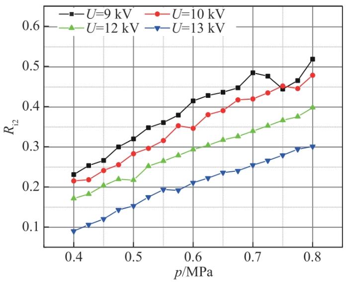 此外,改变电压引起的电场改变也会影响同一气压下流经吸引极的电流占比。荷电粒子在电气体发电装置中的运动主要受到2个因素影响,一是强电场下的电场力,二是曳力。电场力会使荷电粒子从发射极向吸引极运动,曳力则会使荷电粒子被输运到集电极。图15为不同电晕电压下的p-Ri1曲线,由图15可见,在同一气体总压下,流经吸引极的电流与发射极的电流之间的比值Ri1随着电压的增大而增大,这意味着荷电粒子更多地运动到吸引极。而随着总压从0.4 MPa增大到0.8 MPa,出口气体动能增大,曳力在荷电粒子所受力中的占比增大。图16表明,随着流经收集极的电流与发射极的电流之间的比值Ri2值增大,更多的荷电粒子被输运到集电极。
