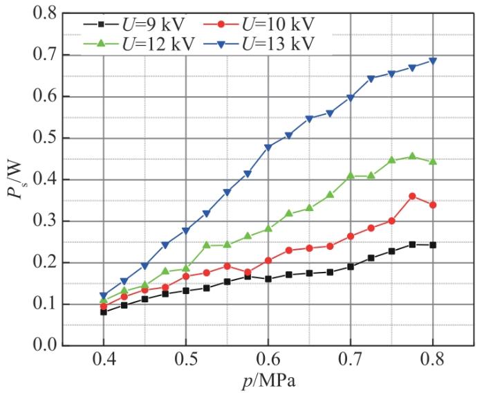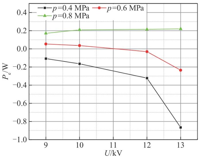 将收集功率Ps减去电晕功率Pr,得到净功率Pe。图10表明,随着总压增大,净功率Pe也随之增大。而当总压降到0.475 MPa时,净功率Pe已经降到了负值,表示此时电晕功率Pr已经大于收集功率Ps,这说明此时整个装置是一个消耗电能的状态。因此要通过电气体发电技术产生电能,气体动能需要足够大。