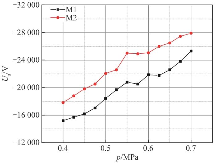 图22表明,接法2的收集电压要明显大于接法1。需要注意的是,在更换电源后,吸引极和发射极的电势已经发生改变,以地势为零电势位,接法1中吸引极的电势为11 kV,接法2中发射极的电势为-11 kV,而收集电压Us是集电极和地线之间的电势差,因此要想达到相同的收集电压,接法1中吸引极和集电极之间的电势差就需要更大。从结果上看,接法2电晕功率上付出的代价要大于在收集电压上带来的收益。