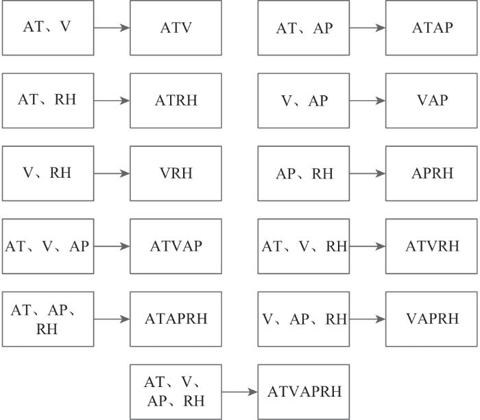对原始数据中的AT、V、AP、RH特征进行不同的组合,然后采用KPCA对各组合的特征进行非线性降维,每一个组合生成一列新的特征。如图2所示,从原始数据中使用11个不同特征的组合并基于KPCA提取11个融合了各特征信息的新特征。新特征融合了原有特征中重要的信息并且舍弃了原特征中的噪声影响。