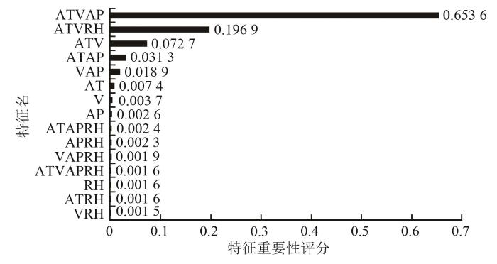 本文提出的基于KPCA-XGB-FS的联合发电站电力输出预测方法流程如下:首先,对原始样本的4个特征遍历2个、3个和4个依次组合,通过KPCA算法对各组合的特征进行非线性信息提取,共生成了11个特征;其次,对所有的特征进行对数变换,使其更加满足高斯分布;然后,基于XGB-FS特征选择算法从原始的4个特征和生成的11个特征中选择最优特征子集;最后,直接将最优特征子集输入XGBoost模型进行训练,构建联合循环发电站电力输出预测模型。在实际的应用场景中,输入模型的环境相关特征可通过当地气象局提前获取,从而对未来的电力输出进行预测。