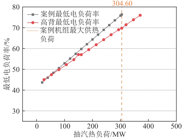 | 图7 高背压下联合乏汽供热改造最低电负荷率与案例机组对比 |