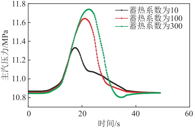 | 图7 不同蒸发段蓄热系数下6 r/min减负荷方向主汽压力变化图 |