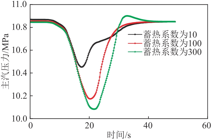 | Fig. 8 Pressure variation diagram of the unit in the direction of 6 r/min load increase under different evaporation section heat storage coefficient |