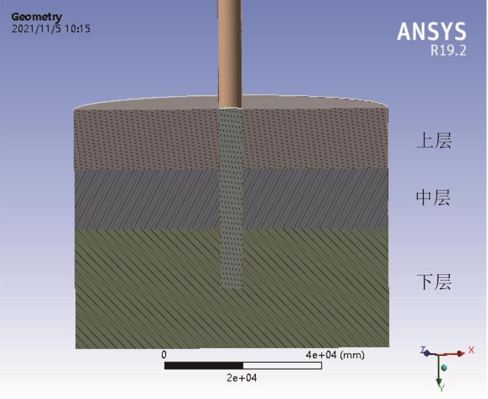 土体边界条件为:底边三向固定约束,外侧径向位移约束。模型中将单桩内部填充物考虑为混凝土。土体与单桩模型内部截面示意图如图3所示。