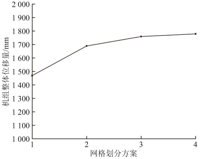 由图9可知,机组整体位移量变化最为明显,工况1到工况2位移量变化值为497.03 mm,增幅为69.55%;工况2到工况3位移量变化值为578 mm,增幅为47.7%;而在工况3之后位移变化量和增幅明显减小,位移量分别是164.9、164.6、164.6 mm,增幅分别减小为9.21%、8.42%、7.77%。
