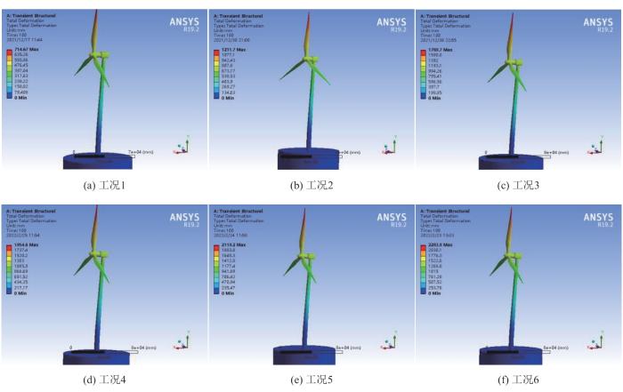 风电机组塔筒位移量是对其进行安全监测与评估分析的重要参量。通过Transient Structure模块进行机组结构瞬态位移响应分析。首先施加脉动风载荷与海浪载荷,进行静力学分析,然后通过APDL命令流将预应力几何刚度矩阵叠加到瞬态分析刚度矩阵上。得到不同工况下机组整体瞬态响应位移云图,如图8所示。