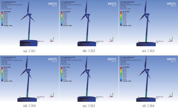 Equivalent stress cloud diagram of tower structure transient response under different working conditions
