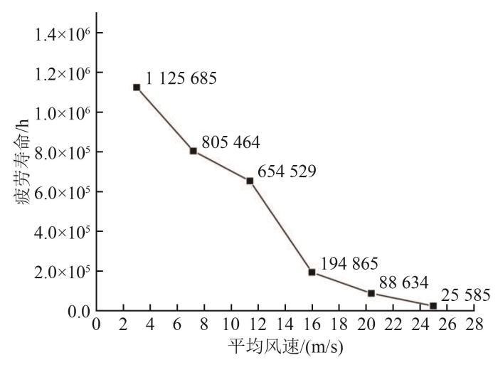 4)随着风速和叶轮转速的增加,塔筒疲劳寿命大幅下降,但都远超实际工作时长;塔筒结构疲劳损伤与安全系数最大值主要分布在塔筒底部与单桩处,与最大应力分布位置吻合,在设计时应优化此处结构疲劳强度。