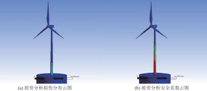 额定工况下塔筒疲劳损伤分布云图与疲劳安全系数云图如图14所示。可以看出,疲劳损伤与安全系数危险值主要分布在塔筒底部与单桩处,与最大等效应力分布位置吻合。