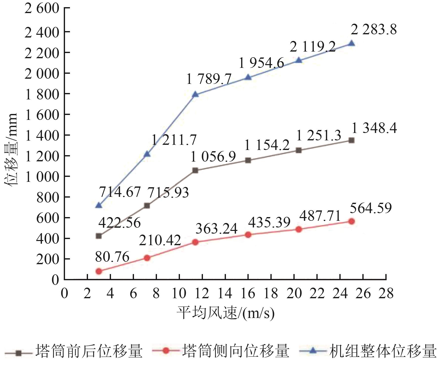 图9 塔筒瞬态响应位移量随平均风速变化曲线 |