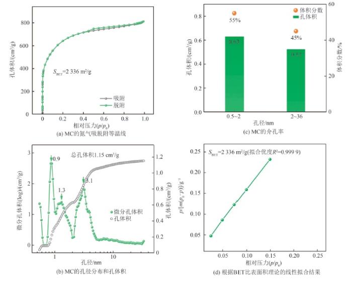 进一步地,通过77 K下氮气的吸脱附测试对MC的孔结构(孔体积、孔径分布和介孔率)和比表面积进行了详细的表征,结果如图2所示。图2(a)中,p、p0分别为压力、饱和压力,SBET为根据BET理论得出的MC比表面积,可以看出,等温线表现为IV型曲线,说明MC的孔结构为微孔、介孔和大孔共存的分级孔结构[23-24],这与图1(b)结果一致。图2(b)呈现了MC的孔径分布情况,基于QSDFT模型的分析结果也表明了其分级多孔结构,其中微孔分布在0.5、0.9、1.3 nm区域内,介孔集中在3.1 nm处。此外,图2(b)孔体积的累积曲线表明,MC的总孔体积为1.15 cm3/g,其中45%的孔体积(即0.52 cm3/g)来自2~36 nm的介孔,55%的孔体积(即0.63 cm3/g)来自0.5~2 nm的微孔(图2(c))。图2(d)中,SBET为2 336 m2/g,显著地高于商业化的活性炭(1 600 m2/g)[25]。MC较高的比表面积和颗粒内部优化的分级多孔结构有助于提供较高的容量,并且能够促进颗粒内部离子的传输和电子传导。