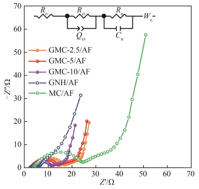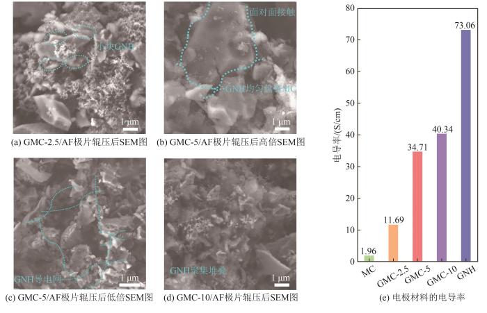 对于GMC-2.5/AF,少量小块的GNH覆盖在MC外表面的小块区域,因此接触面积很小;而且GNH之间彼此孤立且相距较远,不足以形成导电网。而对于GMC-5/AF,随着GNH含量的提高,与MC之间的接触/包裹面积明显增大,如图5(b)所示,GNH均匀地包裹着几乎整个MC颗粒的外表面。由于GNH开放的外表面结构和较高的导电性,可以优先吸附电解液离子并处于高离子浓度一侧,因此在与MC的界面处存在接触电势差和浓度梯度,形成有序、快速的离子和电子双传输通道。同时,GNH彼此相连,在MC之间形成3D多孔导电网络(图5(c)),并且作为桥梁将MC颗粒紧密连接起来,因此有助于降低接触电阻、加快电子的传输。对于GMC-10/AF,从图5(d)可以观察到GNH形成的3D多孔网络;但是值得注意的是,过剩的GNH在MC周围分散不均匀,出现了大块GNH的堆积和聚集。