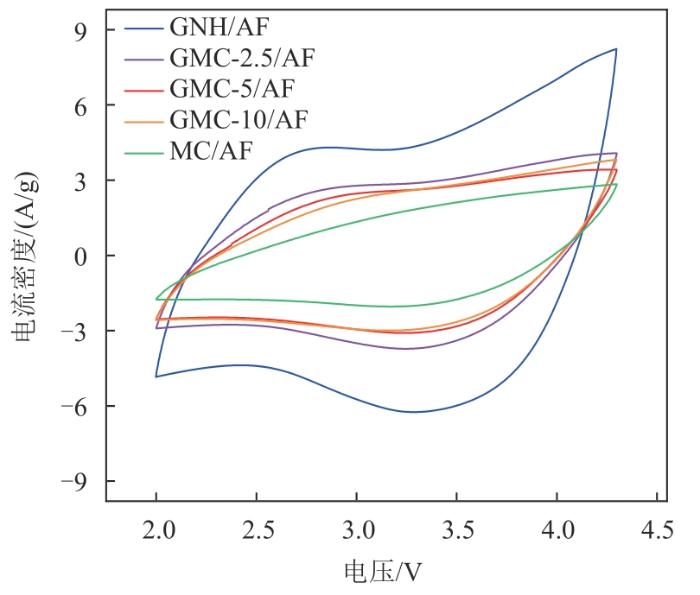 CV曲线可以用来定性表征电极材料的容量特性。对于理想的电容行为,CV曲线呈现对称的矩形。由于矩形面积与充、放电容量之和成正比,所以矩形面积越大,说明容量越高。图6为5种电极材料在扫描速率为50 mV/s时的CV曲线,电压窗口为2~4.3 V。可以看出,所有样品的CV曲线均呈现中心窄、两边宽的类矩形或准矩形,表明电荷存储机制为EDLC特性。另外,通过对比矩形面积,可以得出各样品比电容的大小关系为GNH>GMC-x>MC。