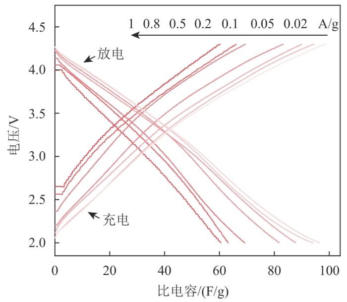 为了定量评估、比较所有样品的电容和倍率性能,在0.02~1 A/g电流密度范围内进行GCD测试,电压窗口为2~4.3 V。图7为GMC-5/AF在不同电流密度下的GCD曲线,可以看出,所有曲线都表现出高度对称性。其他4种电极材料也都具有类似形状的GCD曲线,说明所有电极都具有优异的EDLC行为。
