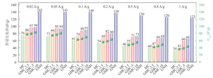 本文中所有的比电容都是通过GCD曲线得到的。图8列出了MC、GNH以及GMC-x复合电极在不同电流密度(0.02~1 A/g)下的质量比电容和线性加和,其中:柱状图表示所有电极的质量比电容;折线图表示复合电极比电容的线性加和