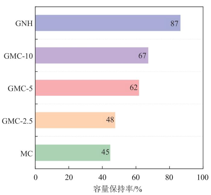 颗粒之间的微观形貌、堆叠方式、接触模式和界面特性会影响复合电极的电导率和电学性质[27-28]。图5(e)列出了通过四探针得到的所有电极材料的电导率。其中,GNH由于良好的本征电子特性以及颗粒间形成的3D导电网,因此具有最高的电导率73.06 S/cm。而对于MC,由于颗粒间是点对点或点对线的接触模式,导致不良的接触和较小的接触面积,不利于电子传输,因此电导率较差,仅为1.96 S/cm。对于复合电极,添加GNH一方面可以在其与MC的界面处产生接触电势差效应,另一方面可以将MC颗粒间接触模式调整为面对面的形式,因此促进电子传输并提高电导率。例如,GMC-2.5添加2.5% GNH,其电导率为11.69 S/cm,比MC提高了5倍。当GNH质量占比增加到5%,GNH均匀地包裹在MC外表面,并且在MC之间构建了均匀的3D导电网络,使电极表面的电流均匀分布,有利于减少电子传输势垒,此时电导率为34.71 S/cm,比MC提高了17倍。当GNH质量占比继续增大到10%时,导电网仍然存在,但是GNH在MC周围分布不均匀,导致结构趋于无序化,电流也会趋向不均匀分布,电导率有轻微提高,为40.34 S/cm。