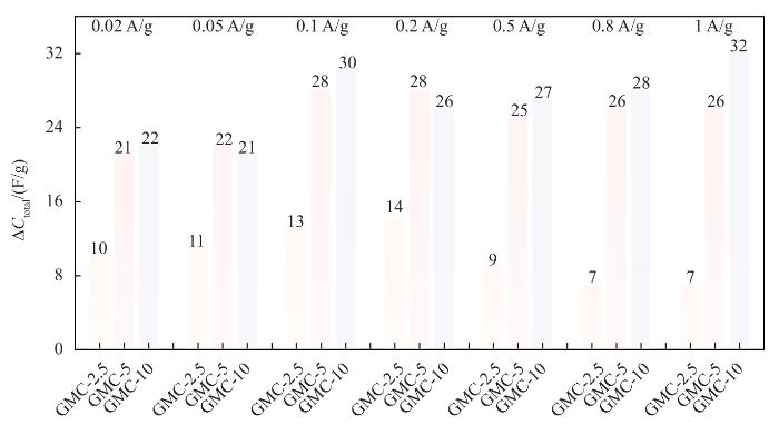 此外,GNH/AF的质量比电容在所有样品中表现出最好的电容性能,而且GNH/AF具有最高的倍率性能(87%)。之所以具有如此优异的性能,是因为GNH更多开放的外表面和相互连接的3D导电网提供了快速的离子扩散和电子传输。为了深入探讨GNH和MC之间的相互作用对电容性能的影响,对复合材料GMC-x和MC的性能进行了详细对比。图10列出了复合电极相对于MC的电容增量ΔCtotal。鉴于复合材料是GNH和MC的混合物,因此,对于ΔCtotal的来源有2种可能性:一种可能性是ΔCtotal完全源自添加的GNH提供的容量;另一种可能性是ΔCtotal除了源自GNH的贡献(ΔC1)外,还源自GNH和MC之间的相互作用引起的额外容量ΔC2。