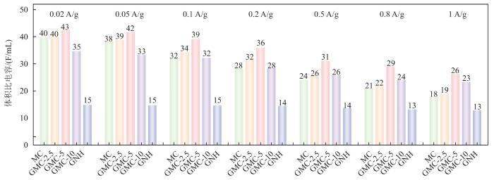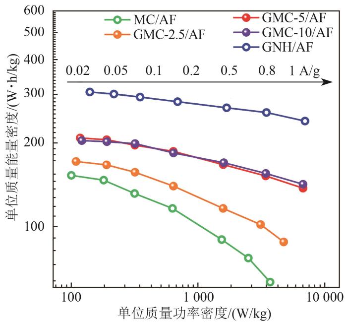 相比之下,3种GMC-x/AF复合电极的所有质量比电容都远远优于相应电流密度下MC的比电容。而且,当电流密度从0.02 A/g增加到1 A/g,复合电极的容量保持率(48%~67%)均明显优于MC(45%)。这些定量结果表明,与MC相比,GMC-x/AF复合材料同时表现出显著改善的电容和增强的倍率性能。