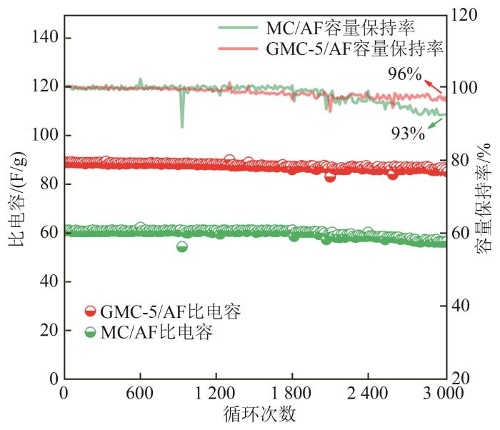 稳定性是评价储能材料性能的一个重要标准。图14展示了GMC-5/AF和MC/AF的循环性能。可以看出,在0.1 A/g进行充放电循环3 000次后,GMC-5/AF的容量保持率为96%,相比于MC/AF(容量保持率为93%),表现出更优异的电化学循环稳定性。