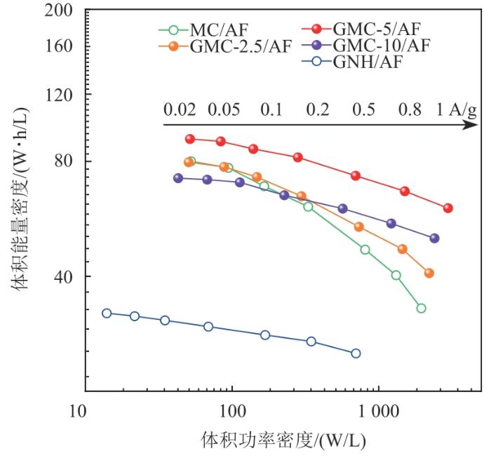 对于工业用LIC器件,除了质量活性之外,体积比电容和单位体积的能量密度、功率密度也是重要的考察指标,这就要求在单位体积的器件或者极片内应尽可能多地填充活性物质[31]。而GNH由于具有极小的堆积密度,因此会影响体积活性。为了确定GNH在复合电极中的最优占比,图15、16分别列出了所有样品的体积比电容、体积能量密度与功率密度。可以看出,GNH具有最低的体积比电容和体积能量密度,这是由于单位体积内活性物质的量较少,因此储存的容量和能量较低。而3种复合电极的体积比电容都比MC高,其中GMC-5具有最大的体积比电容和体积能量密度。当GNH质量占比增至10%时,复合电极的体积比电容和体积能量密度反而降低了,这是因为增加GNH之后,一方面,单位体积内活性物质的量减少,导致容量下降;另一方面,过度的电极致密化会限制离子在电极内的传输,从而降低EDLC性能。结合质量活性的结果,GNH的最佳质量占比为5%,此时面密度可达到9 mg/cm2,即在不损失活性物质堆积密度的前提下,可提高容量和倍率性能。