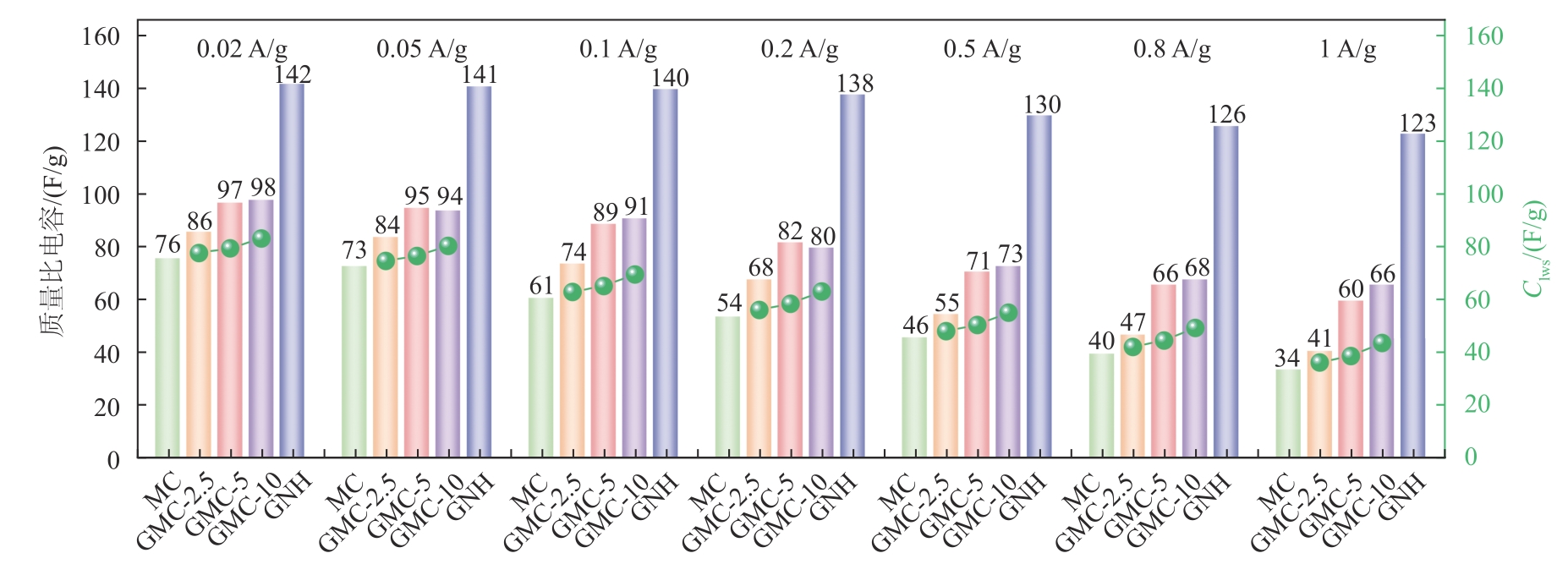 | 图8 5种电极材料在不同电流密度下的质量比电容和线性加和 |