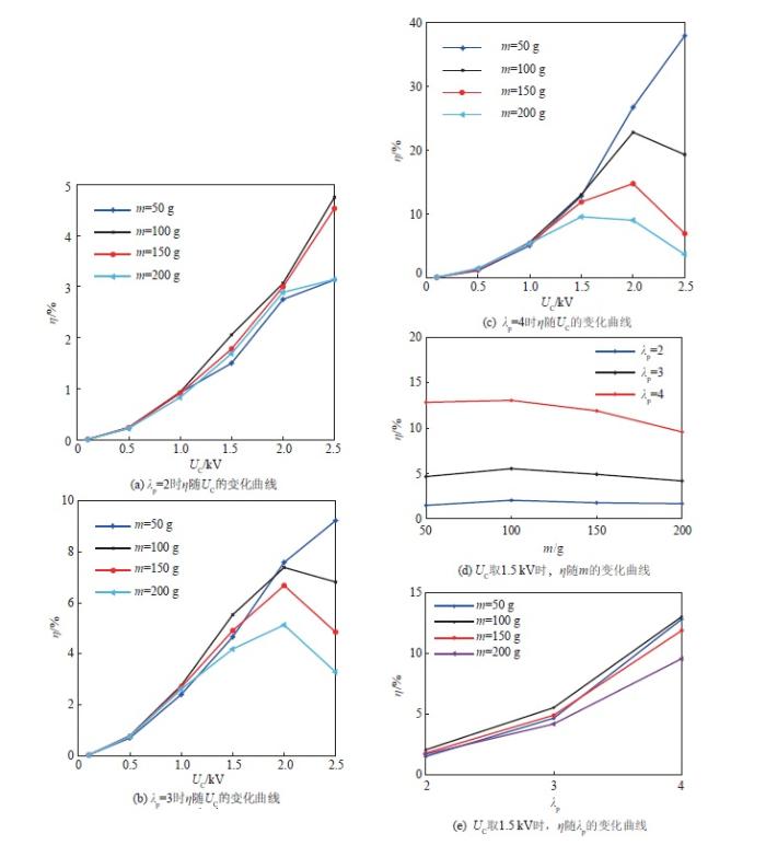 2)在实验中通过预拉伸改变DE薄膜初始厚度,预拉伸倍数越大,薄膜初始厚度越小。在一定范围内,偏置电压、外部负载质量和预拉伸倍数的增大都有助于提高DEG的发电性能。