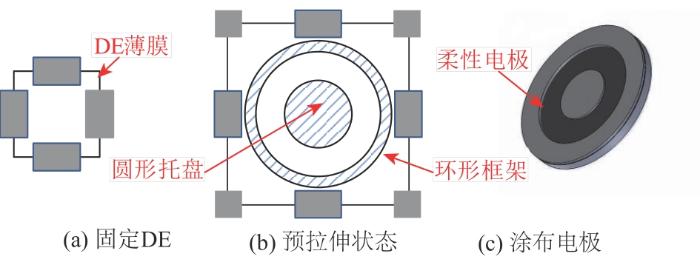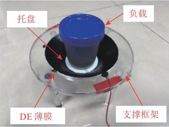 DEG的结构会影响其制作工艺、负载加载方式和发电性能等。本文设计了一种如图1所示的环形DEG。该环形DEG由4个部分组成:1)经过预拉伸的DE薄膜(型号为VHB 4910,未拉伸厚度为1 mm);2)柔性电极(型号为GV-919);3)圆形托盘(直径6 cm,厚度3 mm);4)支撑框架(内径12 cm)。