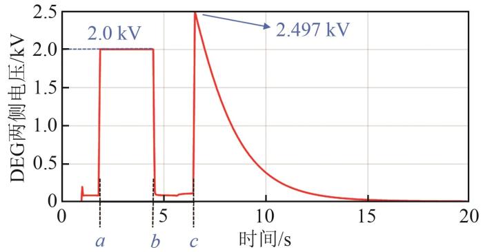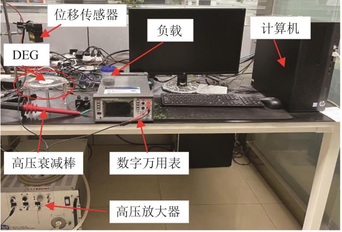 负载放置于DEG的圆形托盘中,使其产生拉伸变形。位移传感器用于测量在负载作用下DE薄膜的拉伸位移。高压放大器用于产生高电压以极化处于拉伸状态的DE薄膜。考虑到DEG的输出电压高达数千伏,无法直接测量,使用高压衰减棒将其衰减1 000倍后进行测量。数字万用表用于测量经高压衰减棒衰减后的输出电压,并将测量数据实时传输到计算机中,放大1 000倍后得到DEG的实际输出电压。