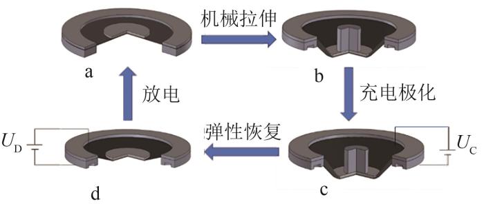 DEG的一个发电循环可以分为拉伸、极化、恢复和放电4个环节,如图5所示。a—b是拉伸环节,利用外部负载对DE薄膜进行机械拉伸,输入机械能;b—c是极化环节,接通偏置电路控制开关K1,在偏置电压UC作用下DE薄膜被极化,其上下表面的柔性电极带有极性相反的电荷。此时,在静电力的作用下,薄膜厚度变小,表面积变大;c—d是恢复环节,断开K1,撤去外部负载,使处于拉伸状态的DE薄膜在自身弹力作用下逐渐恢复到未拉伸状态。此过程中,DE薄膜厚度逐渐增大,上下柔性电极间的距离逐渐增大。上下表面异性电荷分离,异性电荷间的距离逐渐增大。因此,静电力做负功,存储在薄膜中的机械能转换为电能,表现为输出电压UD大于偏置电压UC,实现DEG发电;d—a是放电环节,连接开关K2,释放DEG产生的电能,DE薄膜恢复到初始状态,开始下一次发电循环。