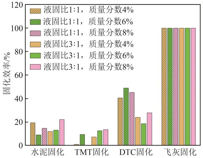 图1为不同固化剂在不同条件下对应的脱硫污泥中铅的固化效率。对于固化剂DTC,液固比1∶1整体脱除效率要大于液固比3∶1,脱除效果最佳的条件是液固比为1∶1,质量分数为6%,此时浸出铅质量浓度为16.53 μg/L,相比原来下降了49%。对于水泥及螯合剂TMT-15,两者固化效果并不好,水泥固化效率最高为18.2%,TMT-15最高固化效率仅为13.7%,两者脱除效率均在液固比3∶1及质量分数8%时达到最高。不同液固比会影响离子扩散速率[18]以及固化pH,因而对于不同固化剂在不同液固比状态下,固化效率表现各异,但对于固化剂飞灰来说,无论液固比及质量分数如何,在其浸出液中均未检测到重金属铅。可见,飞灰对脱硫污泥中重金属铅有良好的固化效果。