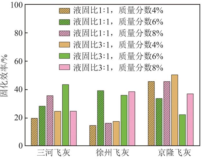 图3为不同飞灰固化同一脱硫污泥的固化效率,可以看出,对于不同飞灰,其最佳固化条件各不相同,三河飞灰在液固比3∶1、质量分数为6%时,最佳固化效率为43.6%;徐州飞灰在液固比1∶1,质量分数为6%时,最佳固化效率为40%;京隆飞灰在液固比3∶1、质量分数为4%时,最佳固化效率为50%