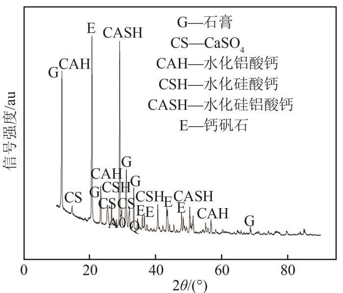 XRF实验表明飞灰中有多种成分与水泥相似,如SiO2、Al2O3和CaO等,可以发生水化反应,生成水化硅酸钙等水化产物以及钙矾石等对重金属有固化稳定性能的物质,尤其富含SiO2、Al2O3,这种化学组分组成还有利于增加固化产物抗压强度,便于后续资源化利用。通过XRD矿物成分分析,证实了水化反应等的发生以及水化产物、钙矾石的生成。通过SEM固化产物样貌分析,进一步证实了水化硅酸钙等水化产物以及钙矾石的生成对重金属的固化稳定作用。