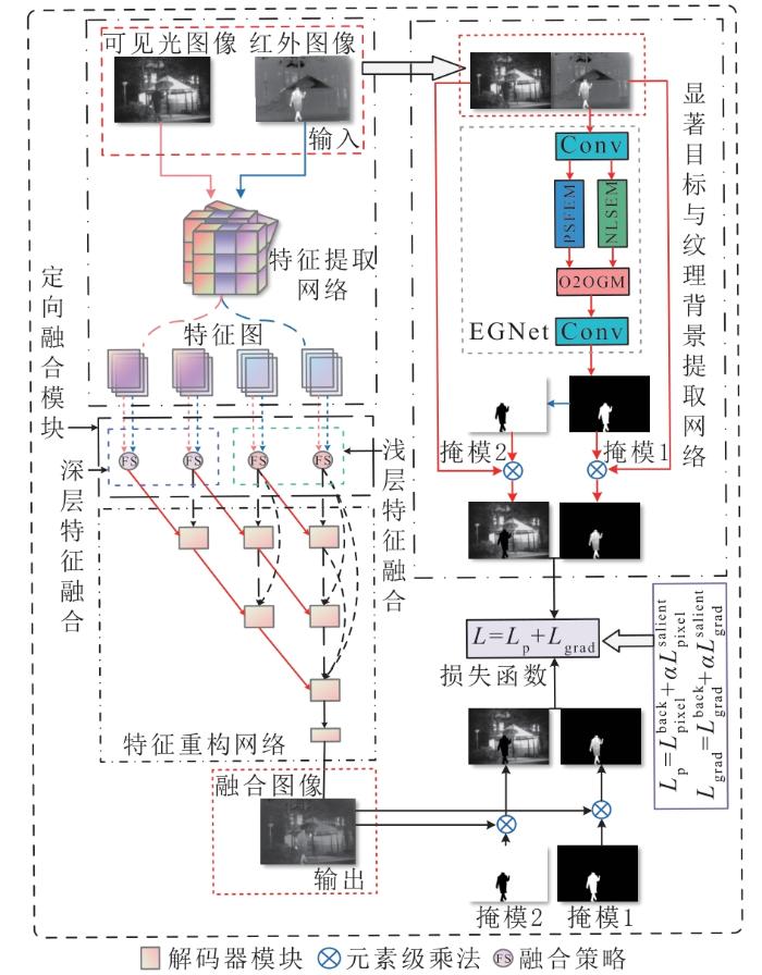 融合算法的网络架构分为4部分,即特征提取网络、定向融合模块、特征重构网络、显著目标与纹理背景提取网络,如图1所示。