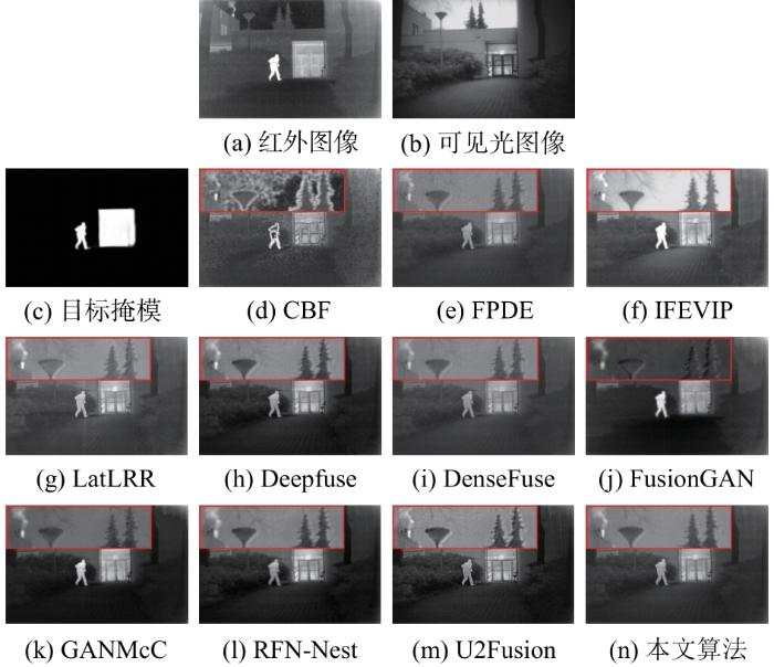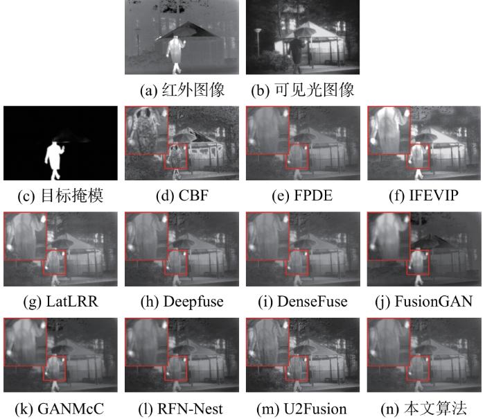 为了验证所提异构图像融合算法的有效性,将其与TNO数据集上先进的10种融合方法进行对比,即红外特征提取和视觉信息保存(infrared feature extraction and visual information preser-vation,IFEVIP)[22]、交叉双边滤波(cross bilateral filter,CBF)[23]、四阶偏微分方程(fourth-order partial differential equations,FPDE)[24]、潜在低秩表示(latent low-rank representation,LatLRR)[25]、DenseFuse[26]、Deepfuse[27]、融合生成对抗网络(fusion generative adversarial network,FusionGAN)[28]、基于Nest的残差融合网络 (residual fusion network-Nest,RFN-Nest)[29]、多分类约束生成对抗网络(generative adversarial network with multiclassification constraints,GANMcC)[30]和统一无监督图像融合网络(unified unsupervised image fusion network,U2Fusion)[31]。由于这10种方法的实现都是公开的,因此本文采用原文中的参数设置。